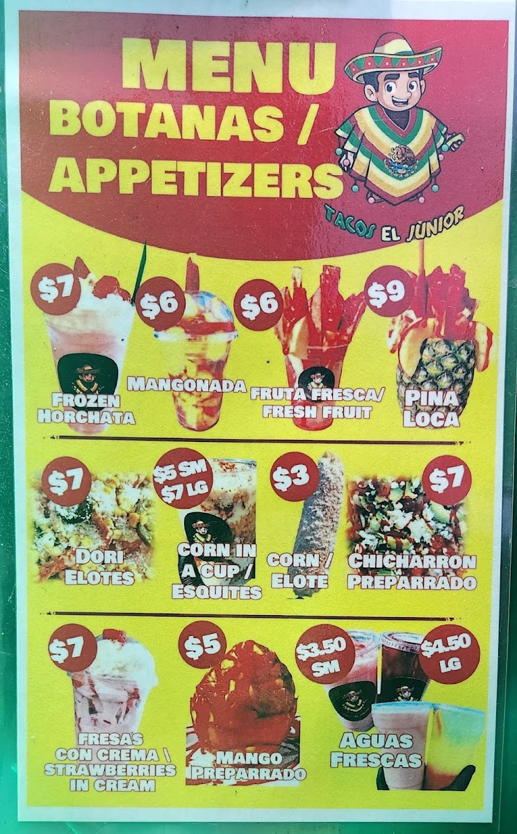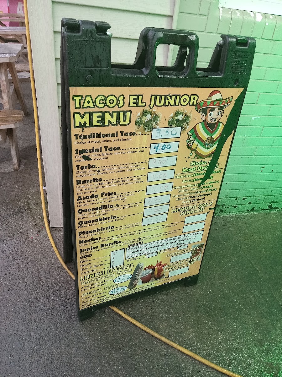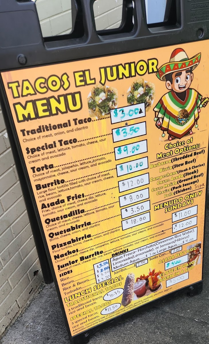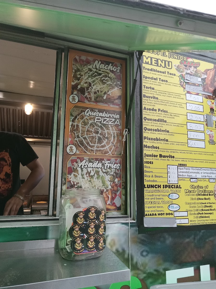 The menu at Tacos El Junior in Toledo offers a delightful variety of Mexican dishes, perfect for any craving. For drinks, you can choose from refreshing options like Agua Fresca (Large) and Agua Fresca (Medium), or go for a classic Jarritos Soda Can. If you're in the mood for something unique, try the Frozen Horchata. Their combos include the flavorful Special Combo, the classic Traditional Combo, and the savory Quesabirria Combo. For sides, you can enjoy Beans, Rice, or a combination of Rice & Beans, alongside Cheese Dip and Chips. When it comes to entrees, you won't be disappointed with options like Asada Fries, Burrito, Junior Burrito, and Nachos, while the Pizzabirria offers a fun twist on traditional birria. For a tasty snack, try their Dorilotes, Esquite, or the sweet and tangy Mangonada. If you're visiting for breakfast, the Breakfast Burrito, Burrito Ranchero, and Chilaquiles are perfect options to start your day. With such a diverse and flavorful menu, Tacos El Junior caters to a wide range of tastes, all at reasonable prices.