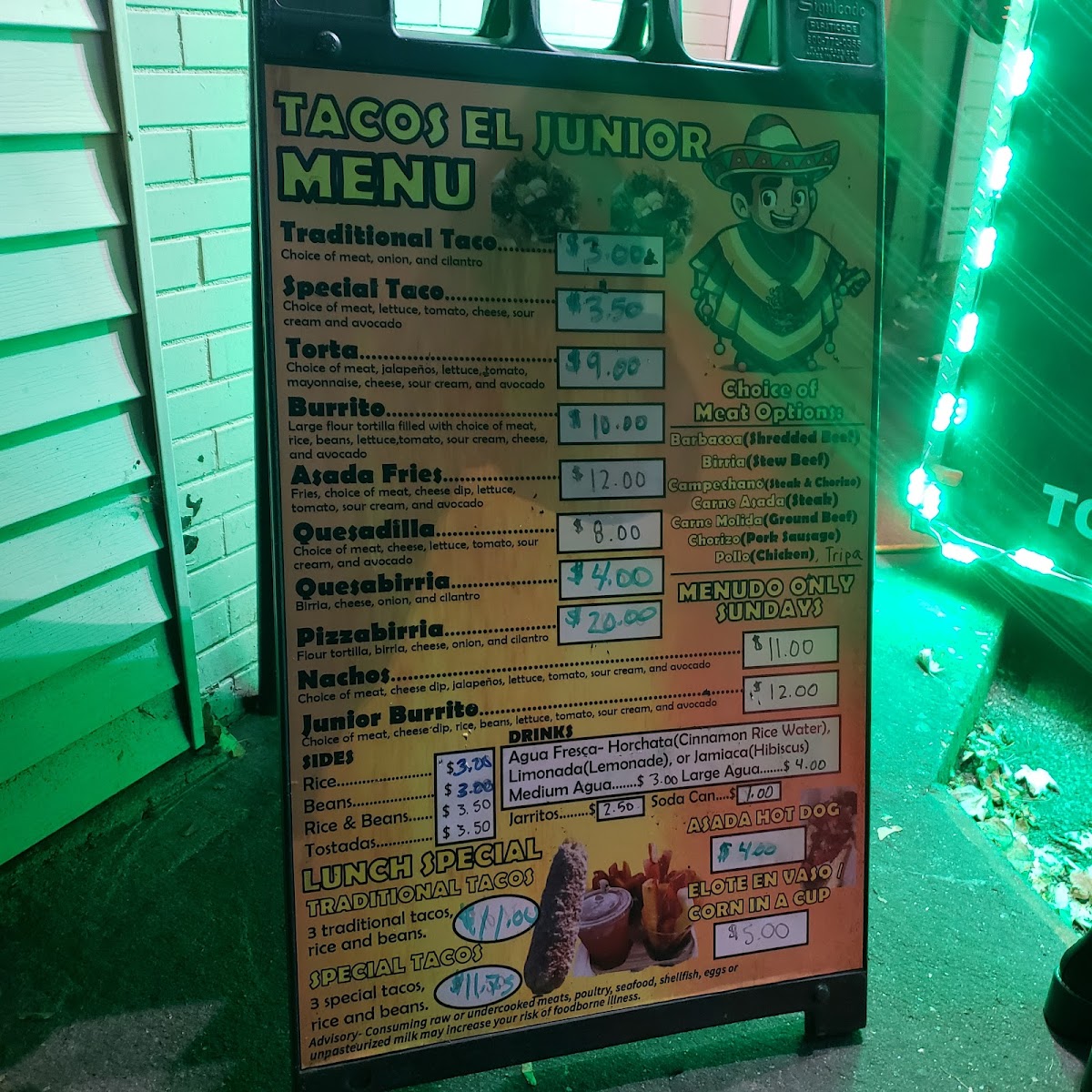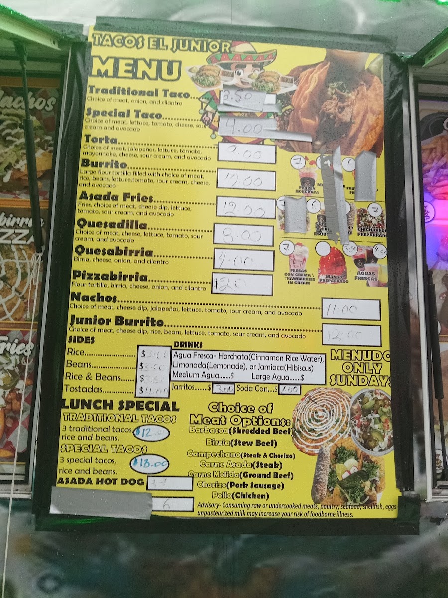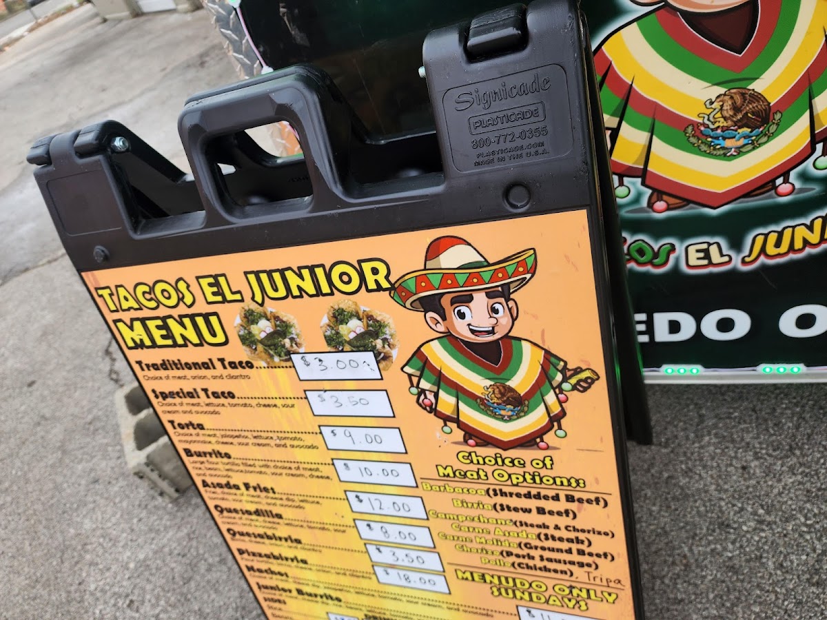 The menu at Tacos El Junior in Toledo offers a delightful variety of Mexican dishes, perfect for any craving. For drinks, you can choose from refreshing options like Agua Fresca (Large) and Agua Fresca (Medium), or go for a classic Jarritos Soda Can. If you're in the mood for something unique, try the Frozen Horchata. Their combos include the flavorful Special Combo, the classic Traditional Combo, and the savory Quesabirria Combo. For sides, you can enjoy Beans, Rice, or a combination of Rice & Beans, alongside Cheese Dip and Chips. When it comes to entrees, you won't be disappointed with options like Asada Fries, Burrito, Junior Burrito, and Nachos, while the Pizzabirria offers a fun twist on traditional birria. For a tasty snack, try their Dorilotes, Esquite, or the sweet and tangy Mangonada. If you're visiting for breakfast, the Breakfast Burrito, Burrito Ranchero, and Chilaquiles are perfect options to start your day. With such a diverse and flavorful menu, Tacos El Junior caters to a wide range of tastes, all at reasonable prices.